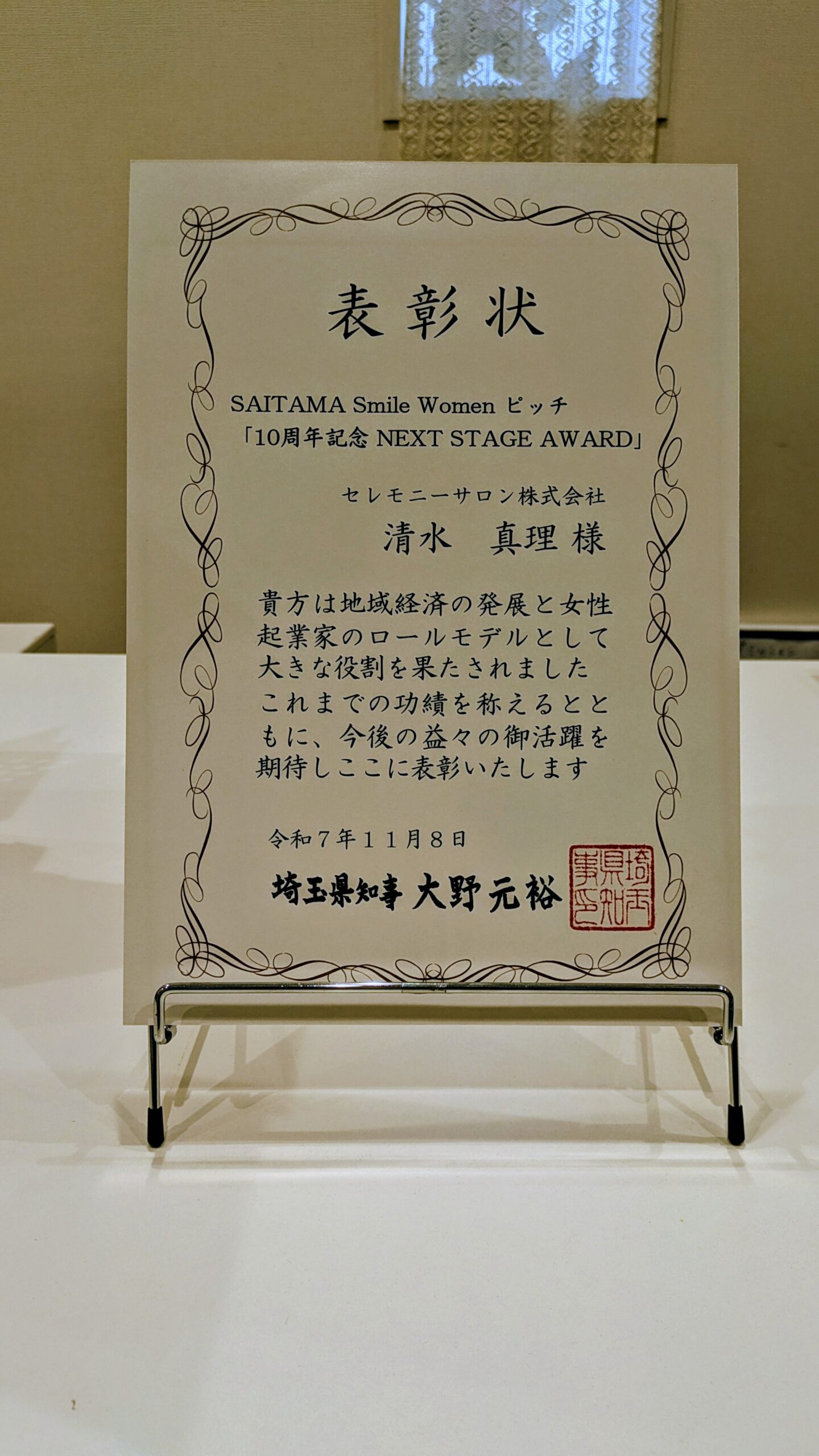 大野元裕埼玉県知事より表彰状をいただき、心から光栄に思います。