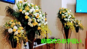 お世話になっています教会の結婚式の生花アレンジを 担当させていただきました。   黄色と白と緑とご要望があり、作成致しました。 早く、沢山の方が集まりお祝いが出来ると良いですね。 おめでとうございます!!お幸せ