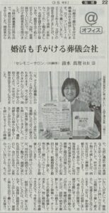 スミレクラブ代表の清水真理が、読売新聞社の取材を受けました! 2021年2月9日 本日(2月9日)朝刊の読売新聞にて「婚活も手がける葬儀会社」のお題で掲載されております。 ・葬儀経験ゼロの状態から、経営者を始めたわけ ・葬儀会社から婚活をはじめたきっかけ ・大切にしていること などを自分の体験をもとに 続きを読む »