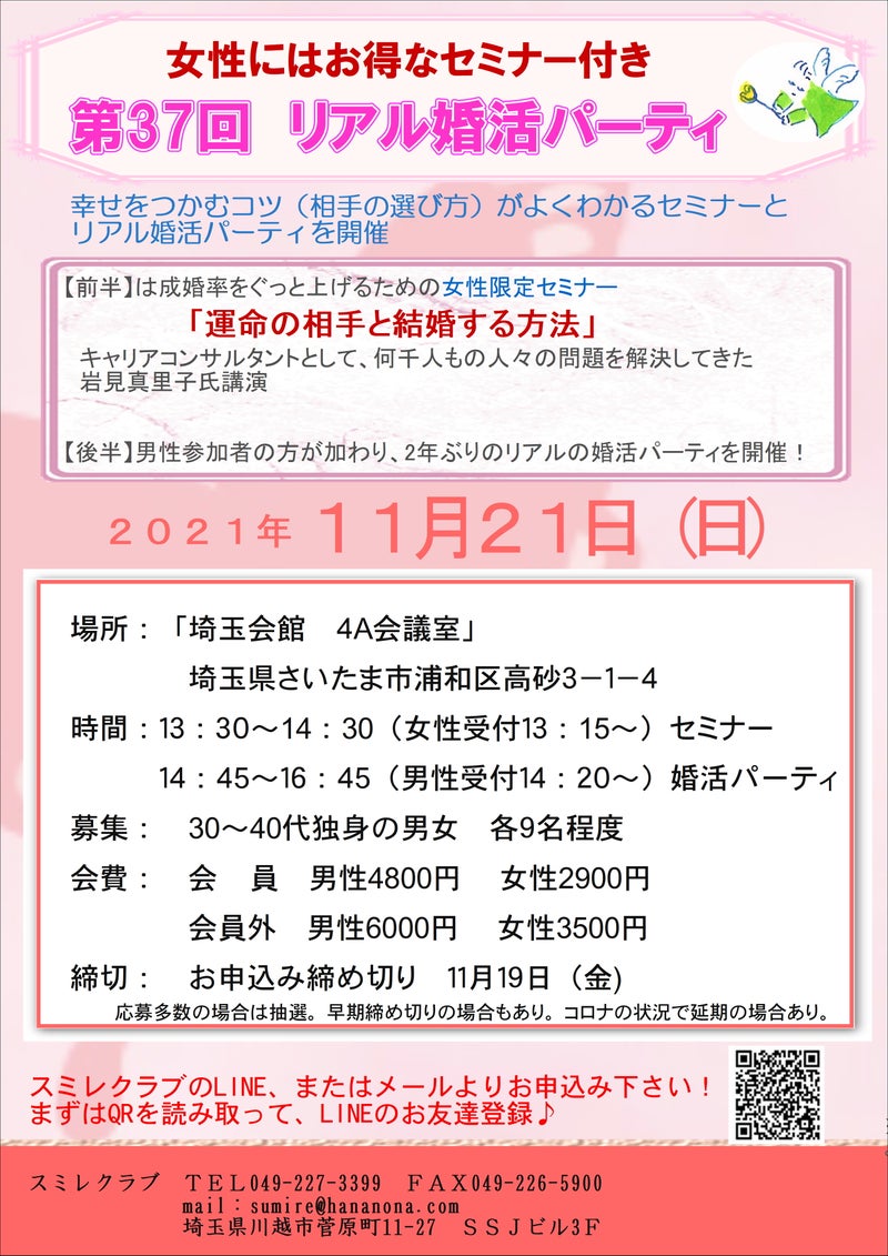 女性にはお得なセミナー付き♥「第37回リアル婚活パーティ♪」
