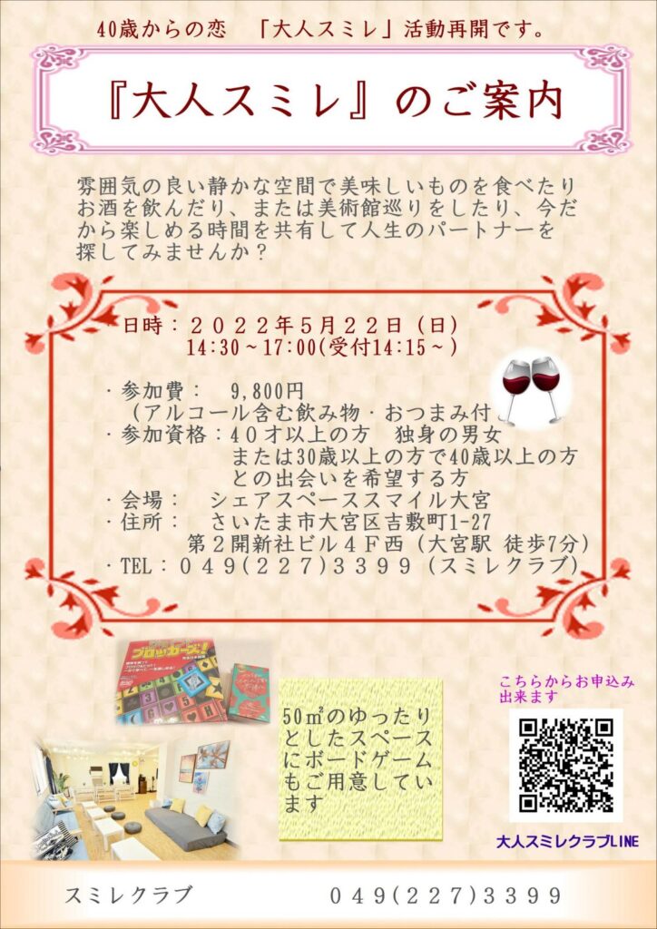 参加は40才からの独身男女、または30才以上の方で40才以上の方との出会いを希望する方になります。