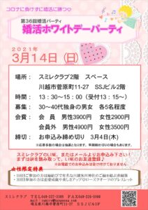第36回婚活ホワイトデーパーティ(対面式)を開催します! 2021年2月26日 3月14日(日)第36回婚活ホワイトデーパーティ(対面式)を開催します! コロナでも婚活を頑張りたい! そんなスミレクラブの思いから、少人数ではありますが対面式での婚活パーティを企画致しました。 少人数ならではのアットホ 続きを見る »
