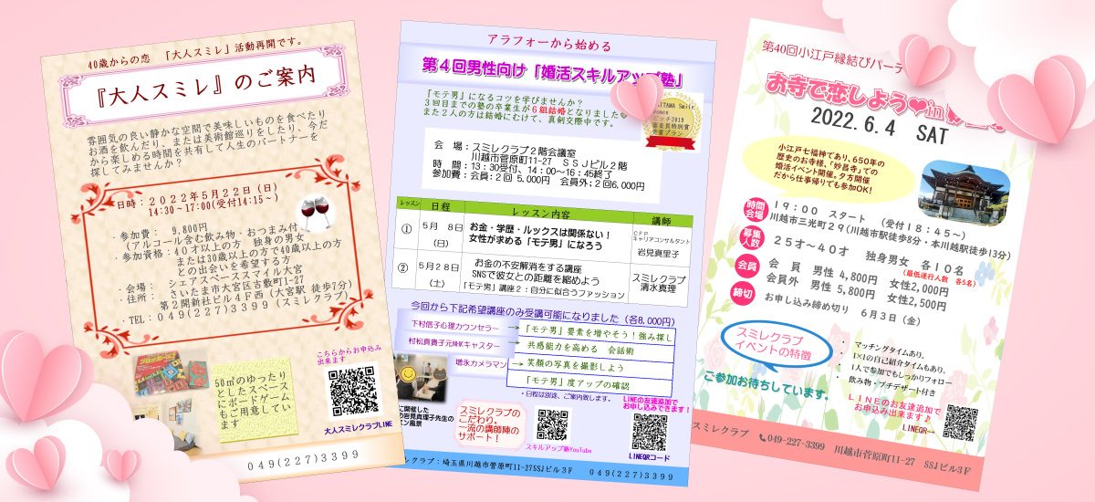 男性向け 婚活スキルアップ塾、小江戸縁結びパーティー、40歳からの大人スミレクラブなど独自の婚活イベントを実施しています!